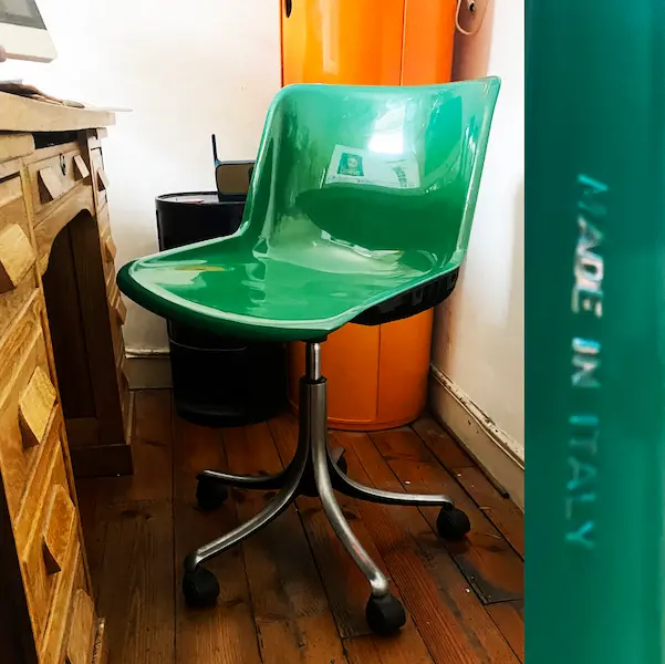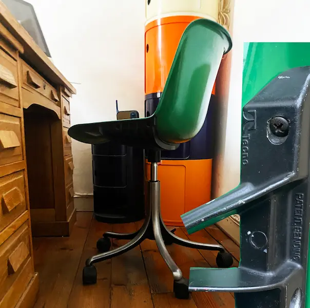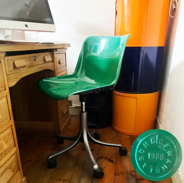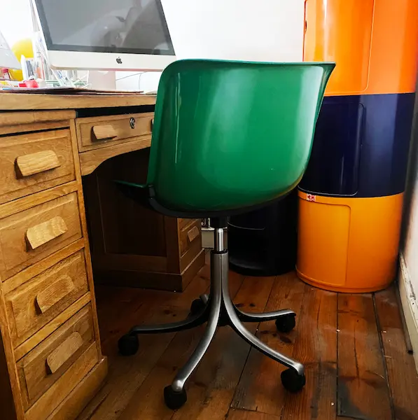 Chaise de bureau Modus par Osvaldo Borsani pour Tecno, design 1972, édition 1988. Fauteuil pivotant réglable en hauteur, coque en plastique, piètement et roulettes en acier inoxydable satiné. Excellent état, légères traces d’usage. Dimensions : 80 x 60 x 60 cm.
