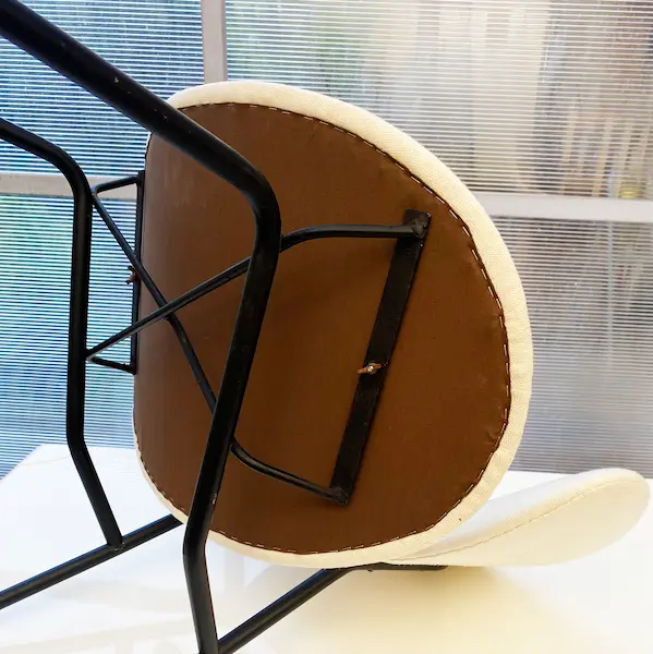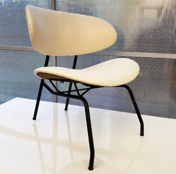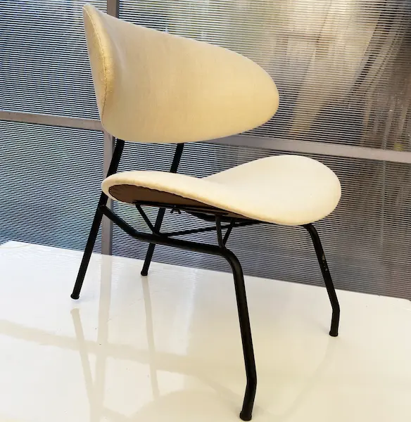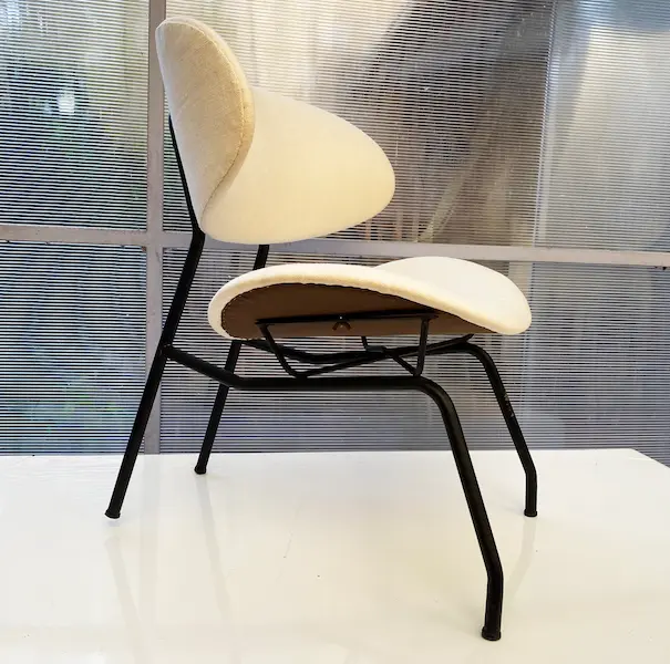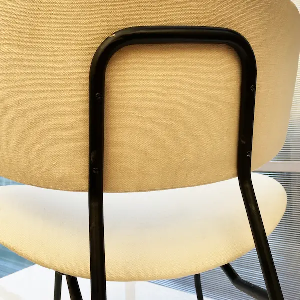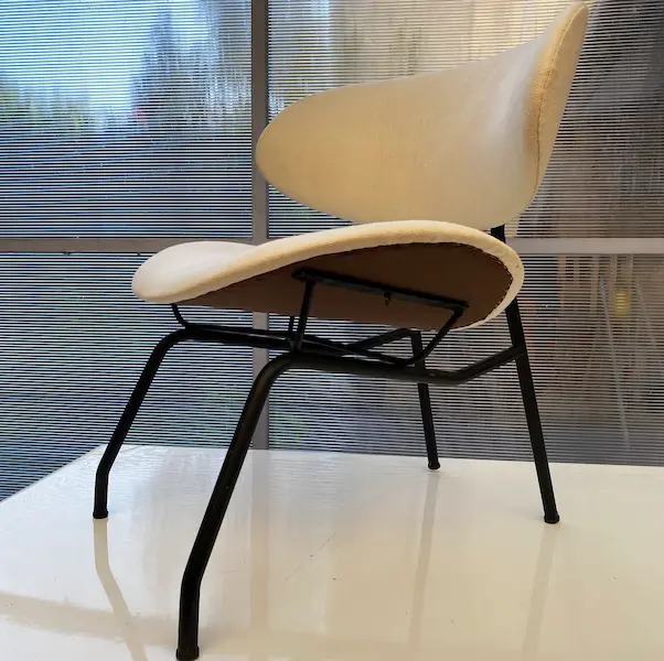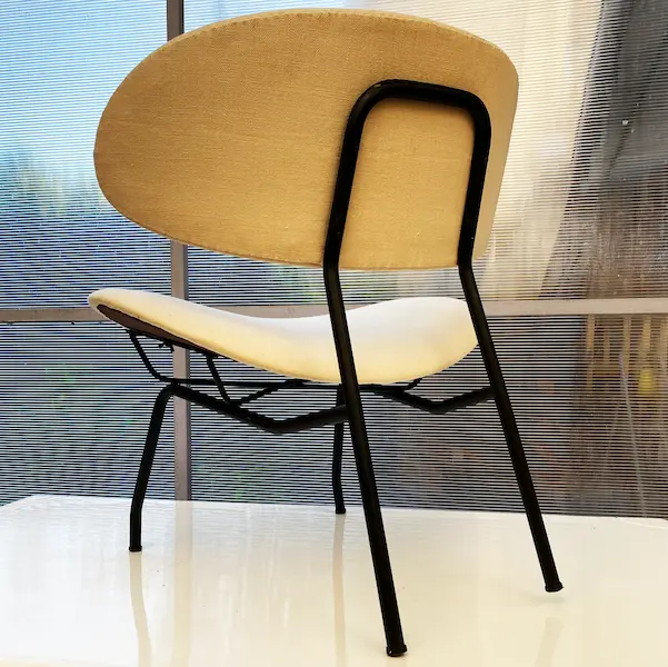 Chaise Rino Vernuccio (1958) pour Poltronova. Pièce iconique du design Italien des années 60/70. Retapissée en lin. Design épuré par un architecte primé (Pont Affrico, Florence). H : 66 cm, assise cm 60×43.