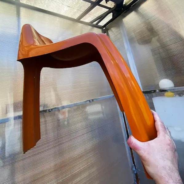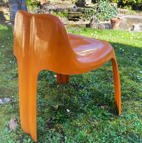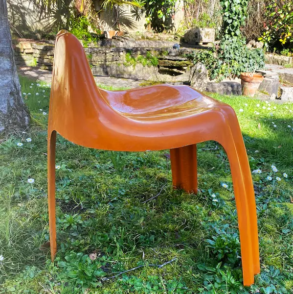 Chaise Ginger par Patrick Gingembre, début années 1970, édition Paulus. Structure tripode en fibre de verre laquée orange, gel coat brillant récemment poli. Superbe patine, très bel état. Dimensions : H 63 × L 56 × P 56 cm. Pièce design vintage emblématique des années 70.