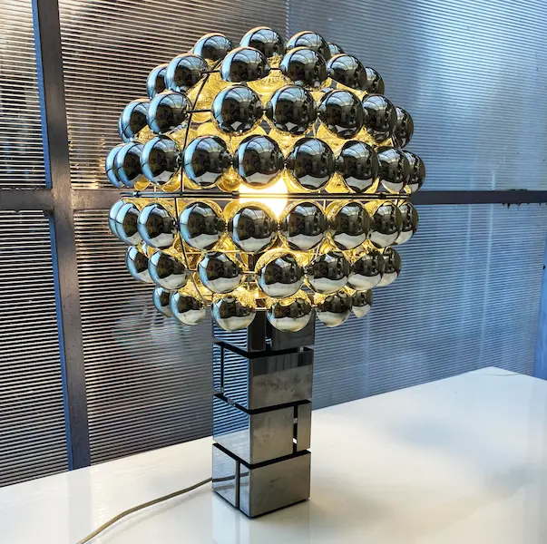 Pied en métal chromé (28,5×10 cm). Dimensions : H 60 cm, L 38 cm, P 38 cm. Quelques manques de chrome sur l’abat-jour
