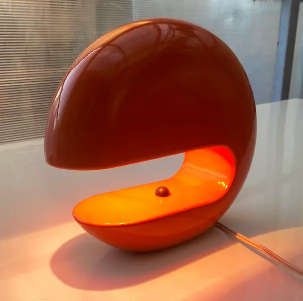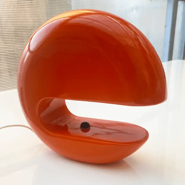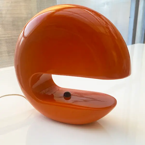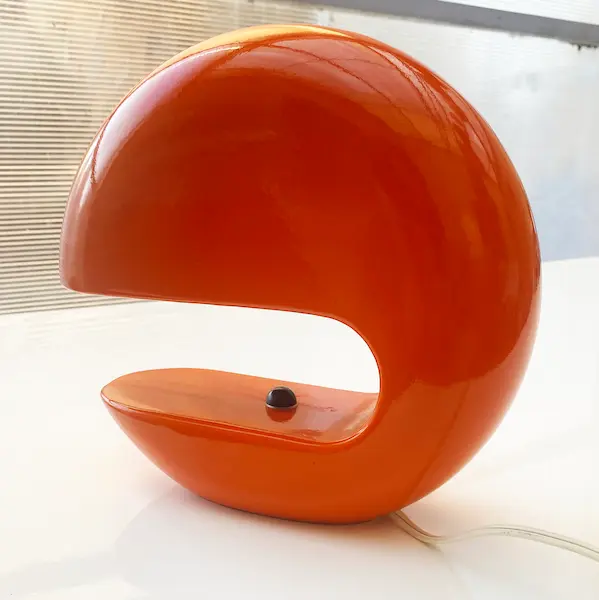 Lampe en céramique orange éditée par Sele-Arte, Italie, années 70, avec interrupteur Castiglioni. Design vintage emblématique, lignes sculpturales et couleur vibrante. Dimensions : 23 x 8,5 x 22 cm (h). Pièce en très bel état, idéale pour sublimer un intérieur design 20e siècle.
