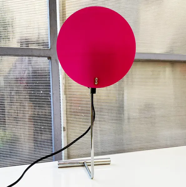 Lampe de table Lumess Switzerland vintage rose et chrome (H. 43,5 cm disque diam. : 18 cm). Un design eighties collector en métal et acrylique, en excellent état. Parfait pour une touche pop et chic de la période 1980