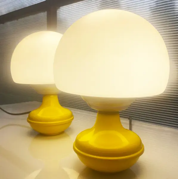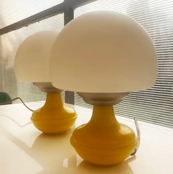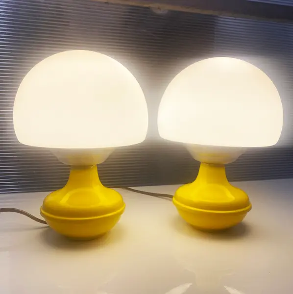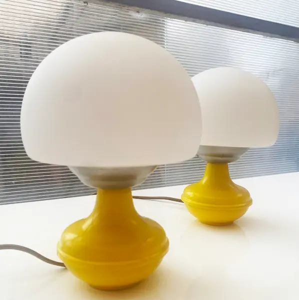 Illuminez votre intérieur avec cette belle paire de lampes Space Age italiennes des années 60. Base en métal jaune vibrante et abat-jour en verre opale. Un design emblématique de l’ère du mobilier des années 60/70. Hauteur 22 cm. Très bon état, idéale pour collectionneur ou amateur de design vintage.