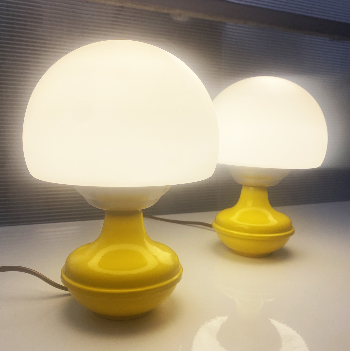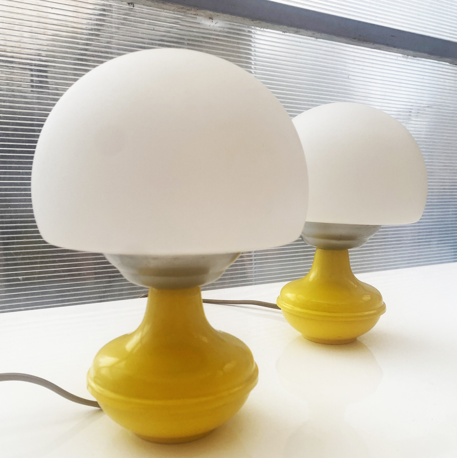 Paire de lampes space âge années 60 (Italie) jaune en métal avec abat-jour en verre opale. Hauteur : 22 cm Très bon état.
