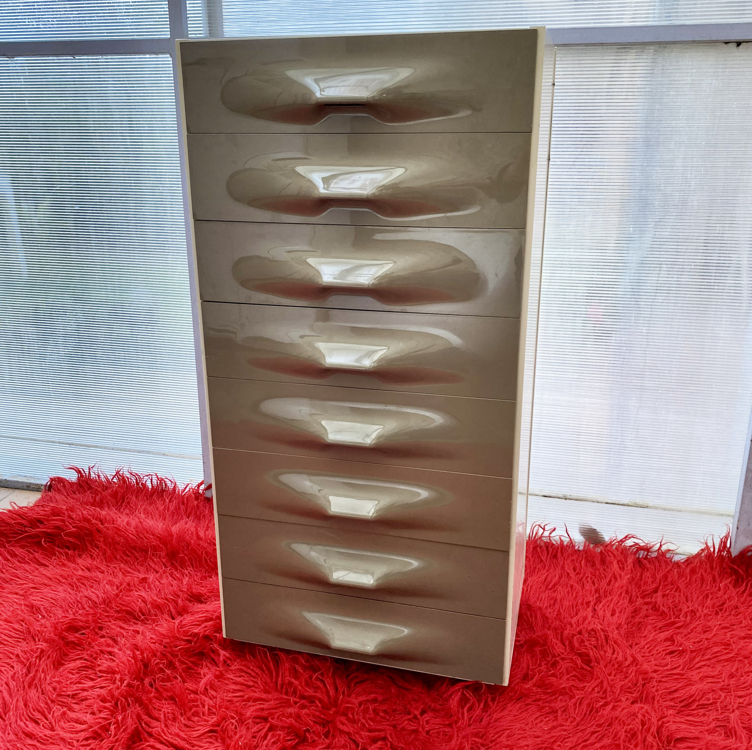 Coiffeuse DF2000, design iconique Raymond Loewy (1965). Meuble vintage 60’s/70’s sur roulettes, coloris marron et blanc crème. Pièce maîtresse Doubinsky Frères en très bonétat. Plastique/aggloméré, Hauteur : 105 cm Largeur : 51 cm Profondeur : 33,5 cm. Ajoutez une touche de Pop Art et d’histoire du design à votre intérieur.