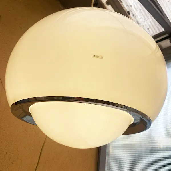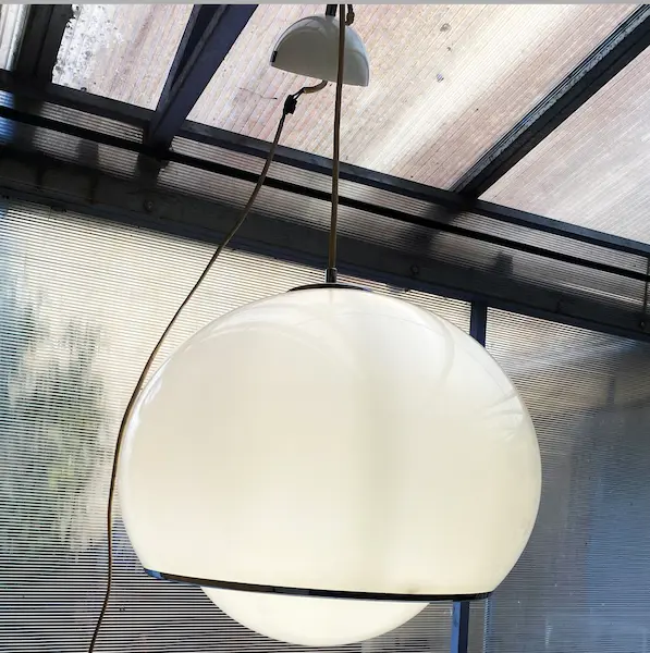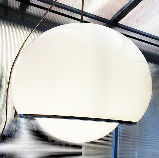 Grande Suspension Bud Harvey Guzzini (années 70), le modèle 48 cm de diamètre le plus emblématique de la série. Pièce maîtresse en Perspex et métal, c’est l’essence même du design vintage 60/70.  très bon état, idéal pour collectionneurs et amateurs de mobilier design italien.