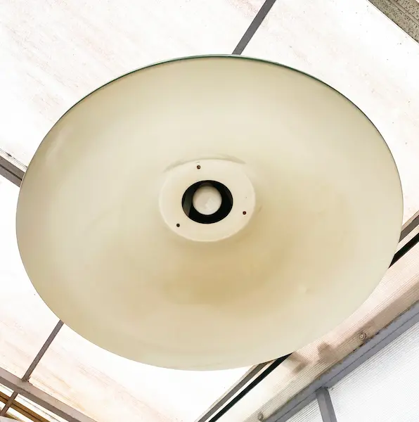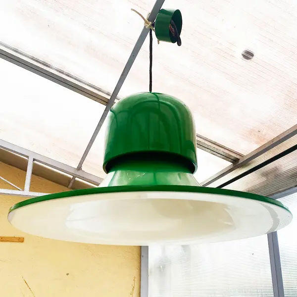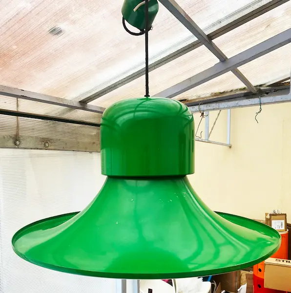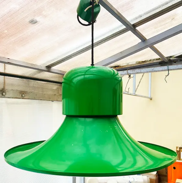Suspension design vintage Campana / The Hat (Stilnovo, 1960s). Luminaire Pop Art vert, métal souvent attribué à Joe Colombo. Ajoutez une pièce iconique des années 60/70 à votre intérieur. Dimensions : Ø 64 cm, H. 32,6 cm.