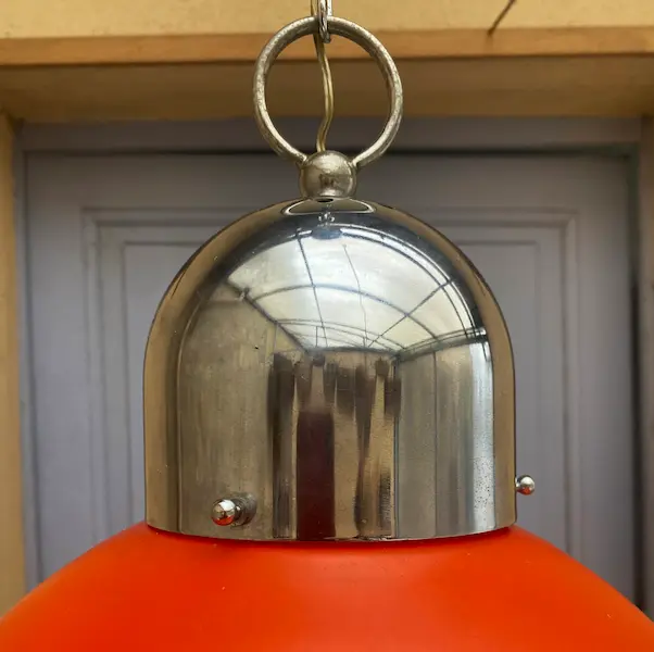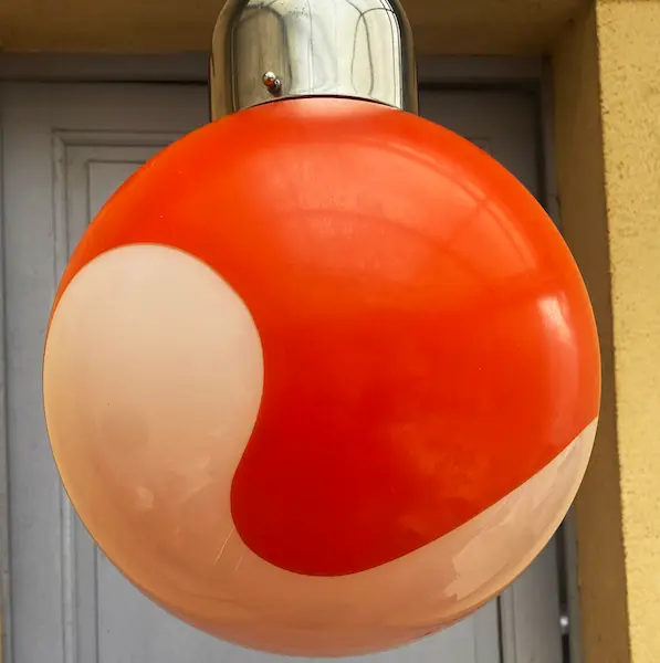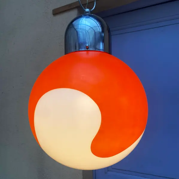 Suspension pop orange des années 60 qui illuminera votre intérieur avec un style résolument vintage et design. Cette pièce du mobilier des sixties présente une sphère audacieuse de 30 cm de diamètre en verre et métal, capturant parfaitement l’esprit optimiste et coloré de l’époque.  Bien que présentant quelques légères usures dues à son âge, cette suspension est conservée en très bon état général et est prête à être installée.